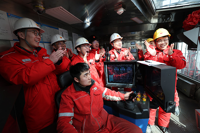 2024年3月4日14时,深地塔科1井成功突破万米大关。图为中国石油报记者余果林(右四)在司钻房与现场工作人员一起庆祝。
