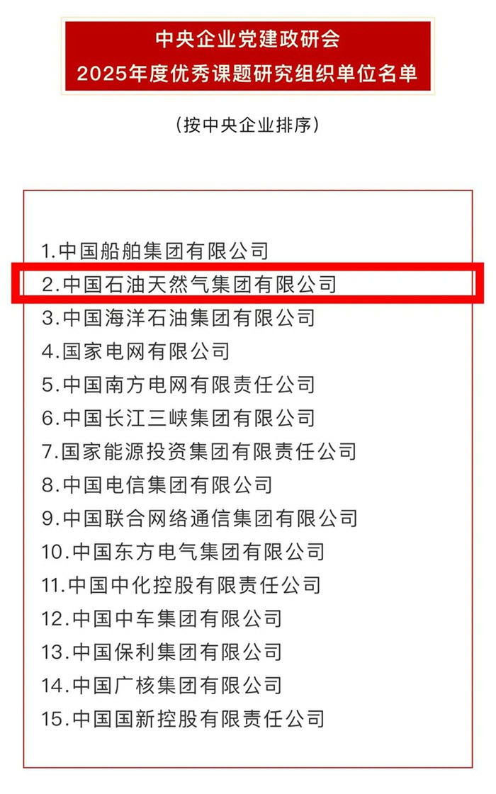 12月28日,国务院国资委中央企业党建思想政治工作研究会公布2025年度优秀课题研究成果评选结果。由中国石油牵头完成的《中央企业国际传播评价指标体系研究》荣获一等奖,中国石油被评为优秀课题研究组织单位。