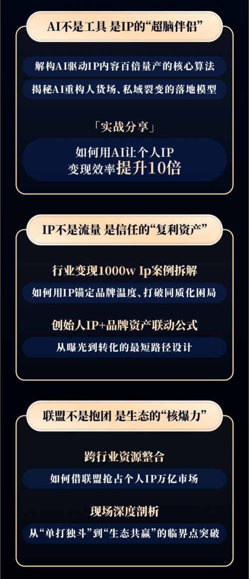 本届峰会全程聚焦IP、AI与联盟三大引擎的深度融合。针对企业家、老板及个人IP变现难的问题,会议将拆解多个千万级营收的真实案例,揭示创始人IP、老板IP与品牌资产之间的联动逻辑,梳理从流量曝光到商业转化的最短路径,助力创业者、创始人及超级个体构建可持续的信任资本。在AI赋能环节,将深入解读AI驱动IP内容规模化生产的算法策略,分享技术重构“人、货、场”及私域运营的实战模型,展示如何借力AI实现内容效率的百倍提升与业绩的指数级增长。关于联盟生态,峰会将重点探讨跨行业资源整合的方法论,拆解从“独自作战”到“生态共赢”的关键转折,帮助所有渴望打造自身IP、实现创富梦想的参与者接入万亿级IP生态网络。