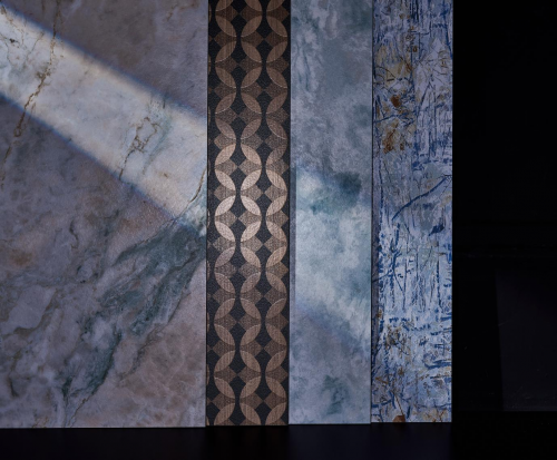 为了让每一寸纹理都传递自然与人文的细腻情感,蒙娜丽莎在纹理复刻上不断突破,从设计创新、色釉淬炼到技术迭代层层打磨:在设计端,团队遍历全球采集珍稀石材、古法织物与原生木材样本,利用高清扫描仪精确捕捉纹理细节,确保每一道纹路的起伏变化、色泽过渡都能精准还原自然本真。色釉淬炼上,历经上千次配方迭代形成专属色料体系,既还原出意大利卡拉拉白的温润奶白,也复刻了珍稀树木的焦糖色年轮,甚至能精准呈现粗麻织物的纤维光泽。3D数码喷墨技术的持续升级不仅实现更精细的色彩过渡,更创新“一石多面”模式,避免了机械重复的单调,使天然石材的冰裂纹理在空间中实现灵动延展。