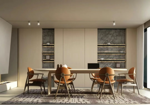 其中,仙米橡木直纹以温柔的仙米色调为基底,纯净柔和,能瞬间抚平空间的浮躁感,让人心境宁静,纹理自然流畅,带着清新自然的气息,为家居注入灵动生机。将其应用于书房背景墙,整个空间便被笼罩在一片恬淡宁静的氛围里,即便在繁忙的工作与学习之余,也能快速卸下疲惫,沉浸在知识的海洋中,享受片刻安逸。