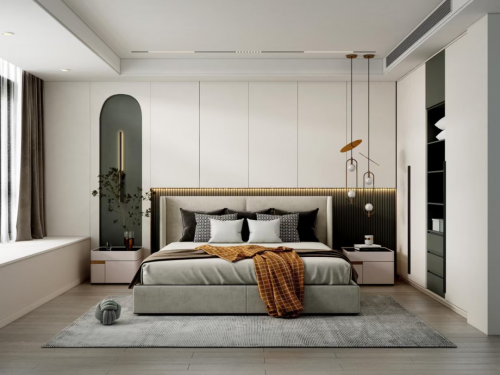 绢织山矾则展现出截然不同的东方美学韵味,深邃的山矾色如同深山幽谷般沉静神秘,自带一种低调内敛的高级感,表面的绢织纹理细腻精巧,如同夜空中闪烁的繁星般错落有致,每一处细节都蕴藏着东方设计的独特神韵,既有着深邃的文化底蕴,又不失灵动与精致。将其应用于卧室场景,用绢织山矾板材制作背景墙,淡雅沉稳的色调能有效弱化外界干扰,营造出静谧祥和的睡眠环境,帮助人们摆脱白日喧嚣,快速进入安稳梦乡,让卧室真正成为放松休憩的避风港。