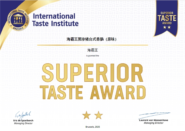 近日,海霸王旗下经典产品黑珍猪台式香肠凭借卓越品质与独特风味,荣获布鲁塞尔国际美味奖章。这一权威奖项由位于比利时布鲁塞尔国际风味评鉴所组织评定,由来自欧洲数十个国家世界米其林主厨、食品品鉴师、美食专家等组成的评审团,以盲测形式对全球数千种食品与饮品进行严格审评,其严苛的评判标准与权威性使其成为国际食品行业品质与风味的重要标杆。