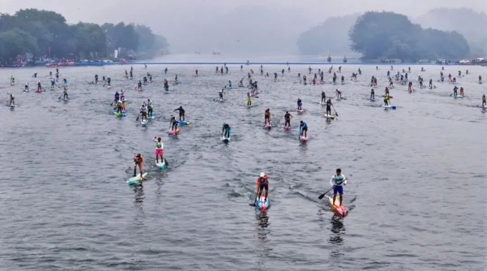 据了解,作为国内最长距离的桨板赛事,33公里的赛道从不是简单的距离叠加,而是一条串联丽水精华风光的“水上画廊”。从艺术气息浓郁的古堰画乡出发,桨板划过千年通济堰的碧波,青石板老街的烟火气随江风扑面而来;途经九龙湿地时,满目苍翠间常有白鹭惊起,原生态芦苇荡在船侧划出涟漪;掠过冒险岛的欢乐浪涛后,南明湖的粼粼波光与城市天际线相映,勾勒出“城在水中、水在城中”的绝美图景。