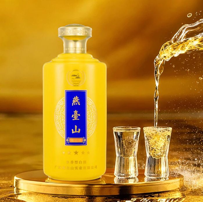 此次上市的燕台山敬宾酒,在产品呈现上极具辨识度。从产品图片可见,其采用明黄色主色调包装,瓶身与礼盒设计融合传统纹饰与现代审美,金色元素点缀其间,既凸显“敬宾”的尊贵感,又传递出壮家文化的厚重底蕴。礼盒上“非物质文化遗产、中国壮家天然洞藏原浆白酒”的标识,直接点明产品核心优势,3L的大容量装也为收藏、宴请等场景提供了更多选择。