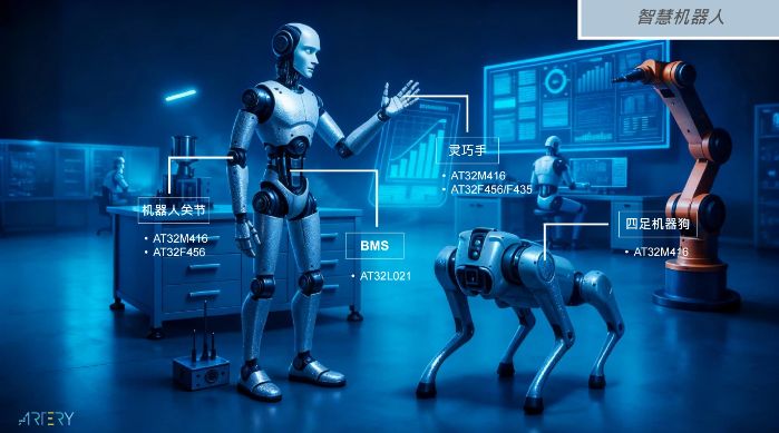 雅特力AT32M416与AT32F456系列MCU为机器人驱动与控制提供了高效、灵活的解决方案。其中,AT32M416集成CAN-FD通信接口,并采用紧凑的QFN32(4×4mm)封装设计,能够完美嵌入灵巧手手指等空间极其受限的结构中,大幅提升PCB空间利用率与系统设计灵活性,现已成功应用于灵巧手与四足机器狗等对体积敏感的场景。而AT32F456系列则以更强性能应对复杂控制需求,搭载Cortex®-M4F内核,主频高达192MHz,内置512KB Flash,可轻松胜任手指的多自由度协同控制及复杂通信任务。其多达3个CAN-FD接口,为整机提供高速、稳定的多节点实时通信能力,加速机器人系统的智能化协同。
