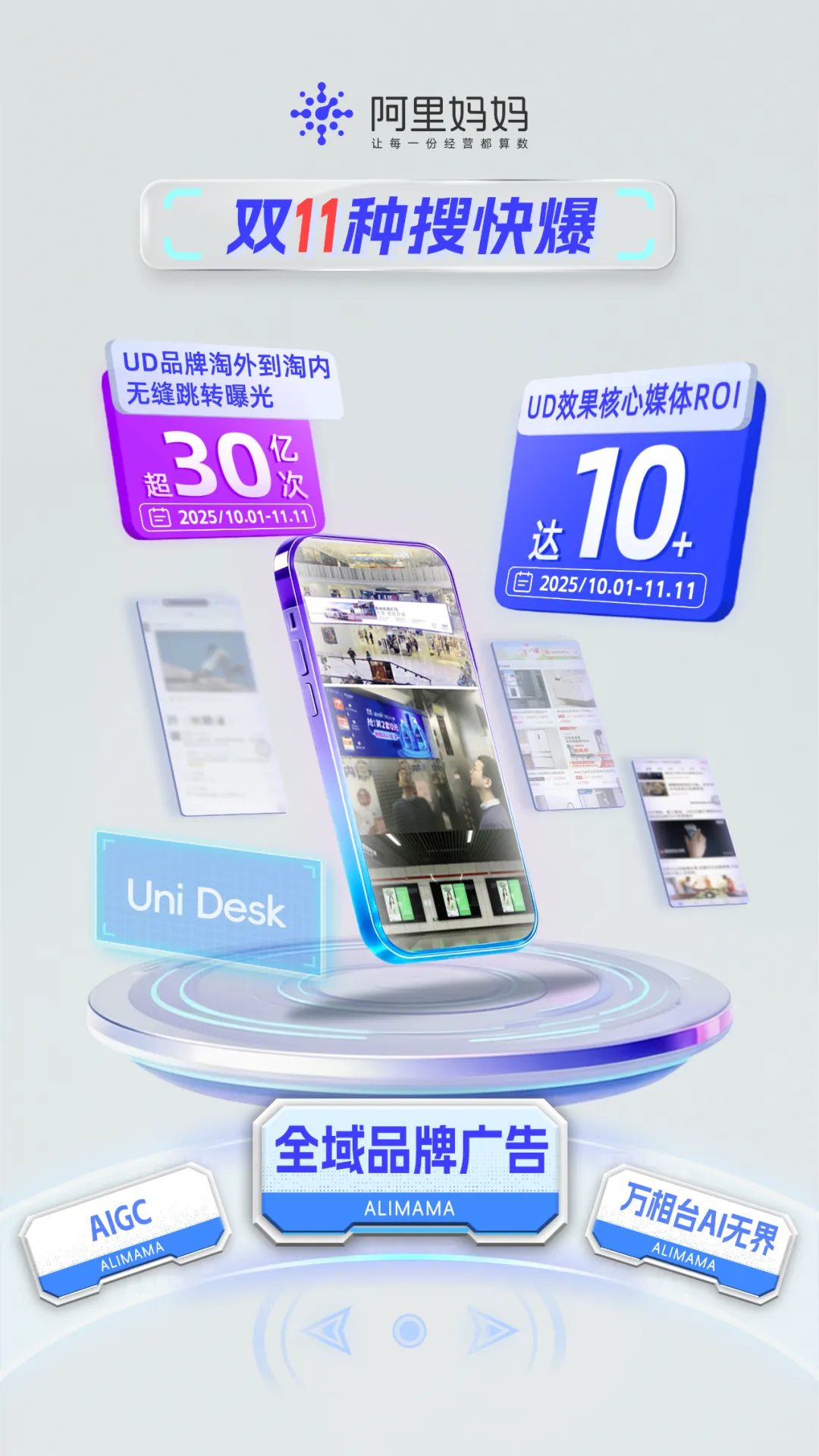阿里妈妈打造的一站式站外推广投放平台Uni Desk,为商家聚合优质媒体资源,精准推动生意转化:「UD品牌」为用户创造超30亿次无缝跳转体验,实现从推广曝光到淘内转化的高效闭环,同比增长超30%,推动品牌成交金额增长近20%。「UD效果」全域媒体百花齐放,为商家精准引流助力成交,整体引流人次达16亿,其中核心媒体渠道重点升级了单品/全店成交模型效果,投产ROI达10+;新增的新客、加购等细分营销优化能力,持续为商家拉动全域媒体的经营增长力。