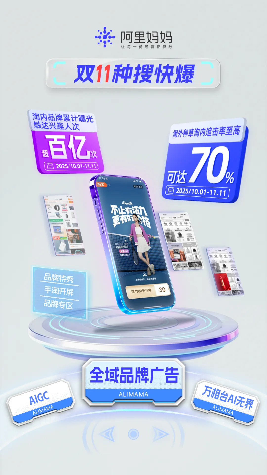 淘内「品牌广告」同样表现亮眼。10月1日至11月11日期间,淘内品牌累计曝光触达兴趣人次超百亿次,引导过亿兴趣进店;淘外种草淘内追击率至高可达70%。其中,「品牌特秀」实现100%精准人群定向,显著提效种搜一体,转化效率大幅提升,ROI远超常规投放;100+行业头部品牌叠加「竞争突围」能力,累计实现26亿次排竞曝光,有效抢占同行业品牌流量,强化品牌心智占位。