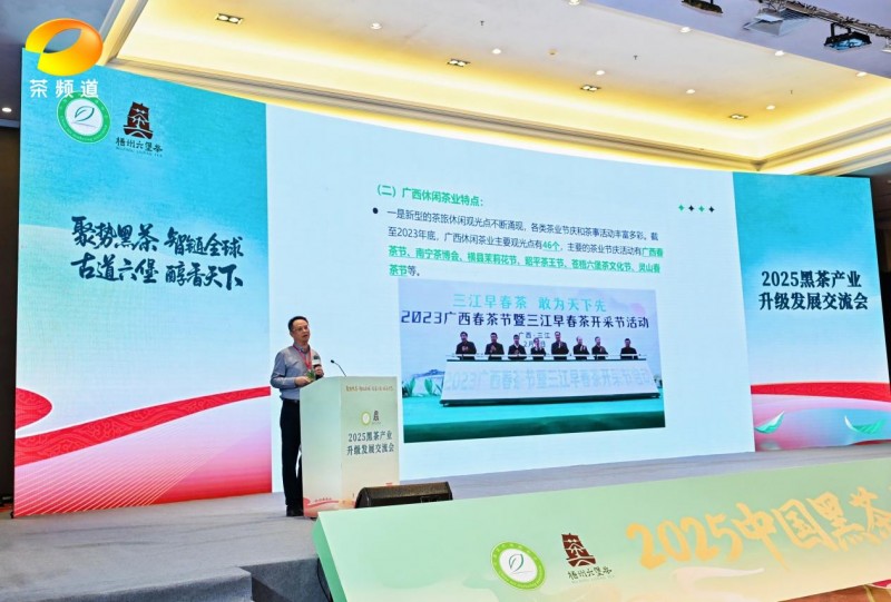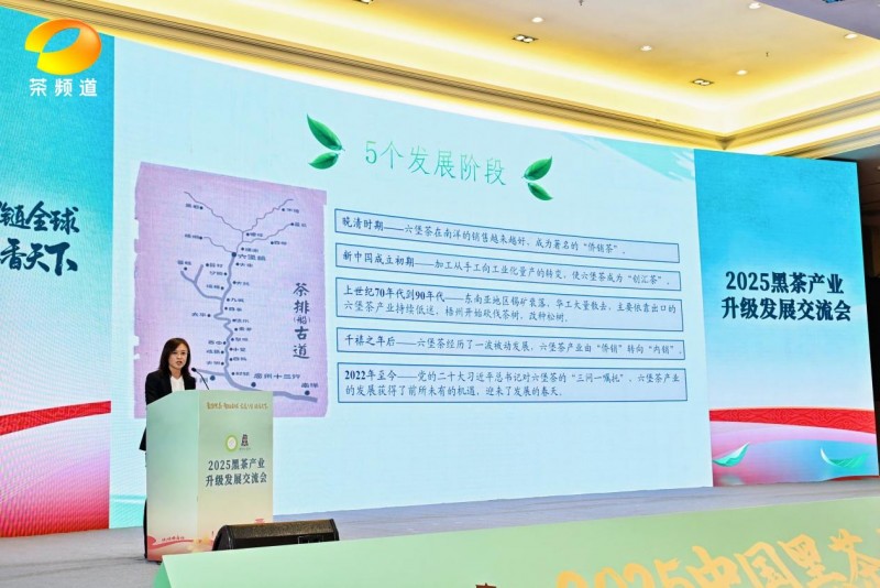 梧州市茶产业发展局党组成员、中心主任于翠平系统推介了六堡茶产业发展成果。通过发挥“原产地、原种茶、原工艺”三大优势,梧州六堡茶品牌价值已达55.07亿元,并成功借助中欧班列、举办“茶和天下”系列活动等方式,持续扩大了国内外消费市场。
