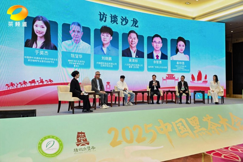 本次交流会还特设访谈沙龙环节,邀请了梧州黑石农业集团董事长姚宝华;六堡茶文化传播大使、全国青联委员、广西青联海外学人华侨界别主任秦梓茜;大咖国际食品有限公司应用研发总监刘晓鹏;益阳茶厂有限公司总经理余智勇;八马茶业股份有限公司董事、总经理吴清标;中国茶叶流通协会外联合作部主任、茶饮咖啡专业委员会主任秘书长于英杰等代表同台对话。嘉宾们围绕“黑茶产品创新研发、智能化发展、品牌提升”等议题展开深度交流,从原料研发、生产工艺、渠道建设、跨界融合等多维度,为黑茶产业升级提供了切实可行的路径参考。