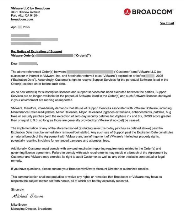 今年以来,博通对VMware产品的政策调整持续加码且步伐密集。4月,其分销商Arrow曾提出VMware计划将许可证最低核心数从16增至72,并对延迟续约加收20%违约金,虽在用户反对后取消,却已传递出向订阅制转型的明确信号。5月,博通进一步向支持到期的永久许可证用户发出“停止及终止使用”函,严禁其在未续约情况下使用任何新更新或补丁,否则将面临法律风险。9月,VMware by Broadcom又发出通知,明确vSphere 7.x 和 vSAN 7.x 的通用支持已于2025年10月终止,相关用户将无法再获得补丁与版本更新。