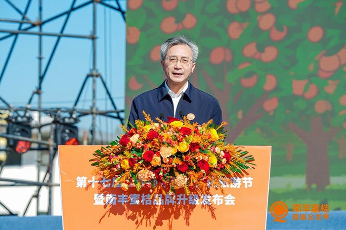 南丰因桔而兴、因桔闻名。受市委书记范小林和市委副书记、市长胡剑飞委托,漆海云代表市委、市政府向各位领导和嘉宾的到来表示欢迎。他表示,本次节会是抚州实施“农业立市”战略、深化“一县一品”差异化发展的深入探索。期盼各位专家学者围绕蜜桔高质量发展建言献策;诚邀各位企业家关注抚州、投资抚州;希望各位经销商当好南丰蜜桔的“推广大使”,让这颗“甜蜜果”香飘更远、惠及更多农户。