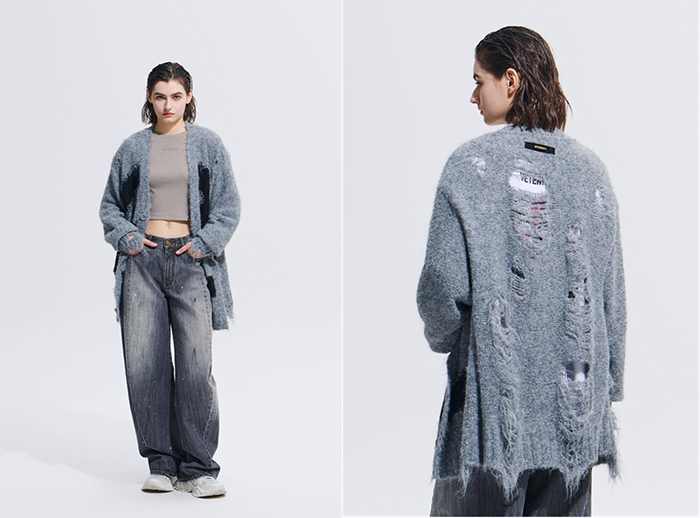 VETEMENTS旧这样针织开衫则大胆前卫地在前襟融入破洞、勾丝设计,直接透出内搭的logo短T,纱线抽丝的袖口裹住手腕,每道毛边都像在说 “别管规训”。