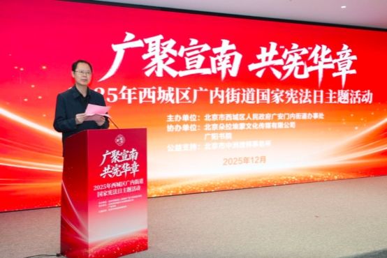 本次活动在西城区广阳书院举行,西城区司法局党组书记、副局长吕丹,西城区广内街道工委书记陈光,街道工委副书记、办事处主任曹阳等领导出席。活动伊始,广内街道工委书记陈光同志发表致辞,强调了宪法作为国家根本大法的重要地位,以及基层开展宪法宣传、筑牢法治根基对推进治理体系和治理能力现代化的关键意义。