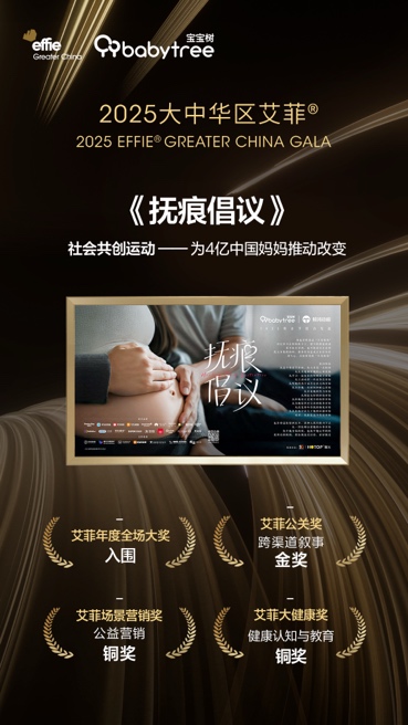在近日揭晓的2025年艾菲国际盛典(Effie Unthinkable Festival)获奖名单中,宝宝树携手鲸鸿动能、胜加集团|耀火HOTOP共同发起的《抚痕倡议》社会共创运动,荣获“艾菲公关奖跨渠道叙事金奖”“艾菲场景营销公益营销铜奖”以及“艾菲大健康奖健康认知与教育铜奖”,并入围年度全场大奖的评选。艾菲奖是以“实效”为评估标准的国际奖项,大中华区艾菲奖由中国广告协会主办,旨在表彰具有实际影响力的营销传播作品,推动行业实效水平的提升。