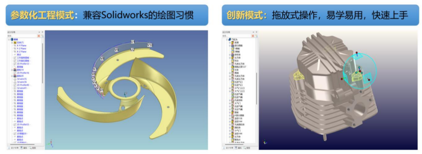在制造企业做整机设计时,前期方案构思和后期参数建模往往要用不同软件配合完成,既麻烦也容易出错。CAXA 3D提供创新模式与工程模式双建模能力,方案设计阶段直接拖拽图素就能快速搭建3D原型,不用纠结参数和约束,方便团队沟通设计意图;进入详细设计阶段,又能切换到支持参数化的工程模式,精确控制尺寸、材料和装配关系,输出可直接交付的模型。