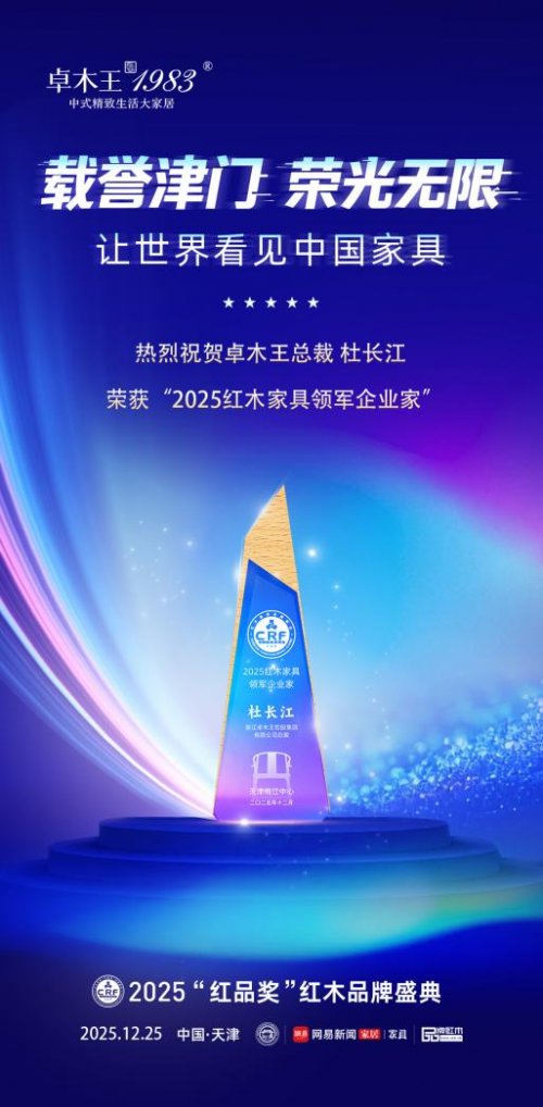 2025年,是卓木王总裁杜长江连续第十二年荣膺“2025红木家具领军企业家”。这一持续性的认可,是对他作为“红木整装第一人”战略远见与坚定执行力的最高褒奖,更印证了从“创领者”到“领军者”再到行业“标准定义者”的完整进化轨迹。