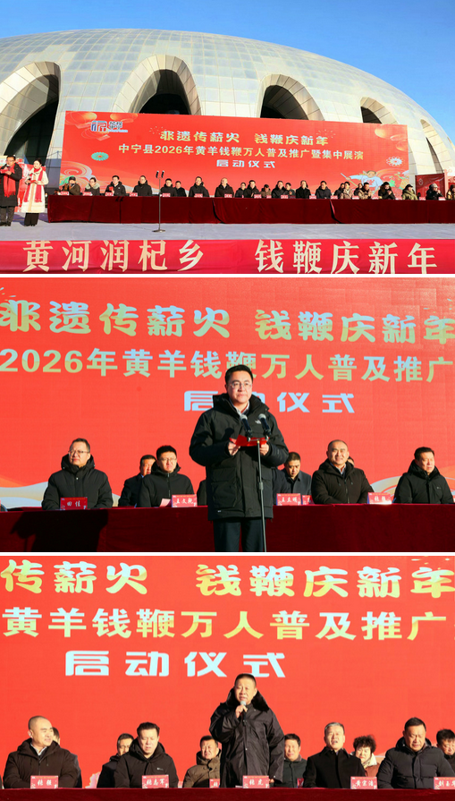 2026年1月7日至9日,由中共中宁县委员会、中宁县人民政府主办,中宁县委宣传部、中宁县文化旅游广电局承办,2026年“非遗传薪火·钱鞭庆新年”黄羊钱鞭万人推广普及暨集中展演活动在中宁县圆满举行。新年伊始的杞乡大地,钱鞭响亮,锣鼓铿锵,上演了一场万民同欢的文化盛宴。