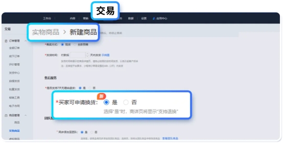 为适配不同商家的业务特性,小鹅通「售后换货」功能提供灵活的自主配置选项。商家在新建或编辑实物商品时,可在“售后服务” 中找到 “买家可申请换货” 配置项,根据商品属性自主决定是否开启该功能。