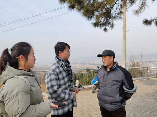 调研团成员还采访了博物馆的工作人员樊银涛及当地村民。蓝田猿人遗址位于蓝田县九间房镇公王岭,距离西安市区较远,交通相对不便。调研团成员王诗琦问到:“遗址面临地理位置偏僻的现实挑战,当地是如何解决这个问题的呢?”樊银涛解释道:“近年来,当地通过修建环山路,将猿人遗址与荞麦岭等景点串联起来,季节性景观如荞麦岭的油菜花、荞麦花吸引了过路游客顺道参观猿人遗址,这形成了一定的区域联动效应,每年的人流量可达17-18万。”村民们则表示农闲时会在遗址周边售卖特产与小吃,这带来了直接的经济收益,而公王村也因为猿人遗址提高了知名度。