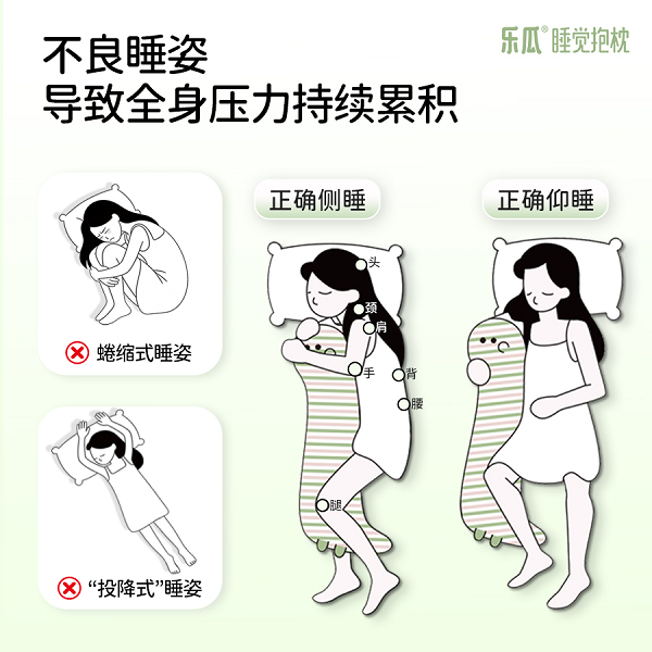 在睡眠用品市场长期被床垫、枕头等传统品类占据的背景下,抱枕更多被视为情绪安抚物而非功能性产品,作为“玩偶”的价值远大于其功能性价值,而FUNMELON乐瓜的突破,始于一个深刻的洞察:现代人的睡眠问题,远不止于情绪本身,不良睡姿导致的全身压力分布不均、脊柱偏移、腰背酸麻才是更深层的痛点。基于此,FUNMELON乐瓜没有选择在传统赛道上内卷,而是率先提出了“一人双枕,科学护睡”的颠覆性理念,将“睡觉抱枕”从一个可有可无的配套用品,提升为能与头颈枕协同作战呵护头颈肩手腿腰背的“护睡系统”。