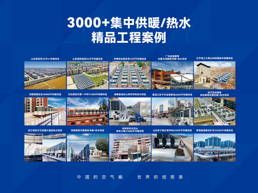 依托强大的技术与智造实力,纽恩泰的产品涵盖家用热水、家用冷暖、商用热水、集中清洁供暖、工农业节能改造,以及海外空气能热泵应用等多个领域,实现全场景适配。产品远销全球80个国家和地区,在国内更是落地3000多个大型标杆工程项目,其中河北赵县超400万㎡城市集中供暖项目,成功为当地约60万居民提供稳定、节能、环保的采暖服务,成为行业集中供暖的典范。