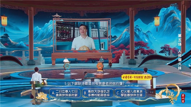 外景题中,康震走进新疆伊犁,看见“馕”这一特色食物,提起诗句“急炊大饼偿饥乏”,道出朴素美味的慰藉力量;杨雨则走进贵州,以“小著盐醯助滋味,微加姜桂发精神”,诠释当地无辣不欢的生活态度。不难看出,这些诗词从来都不是阳春白雪,而是能融入舌尖、浸润日常的烟火诗意。