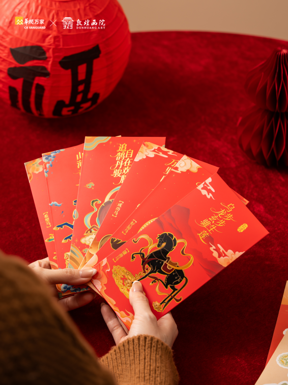 作为本次联名的核心周边,新春红包极具设计巧思,朱红底色呼应马年朝阳之姿,神马腾跃的灵动身影与敦煌经典卷草云纹相映成趣,方寸之间既流淌着千年敦煌文脉,也承载着马年顺遂、阖家安康的美好期许,既是传递心意的节日载体,也是兼具颜值与收藏价值的文化小物。