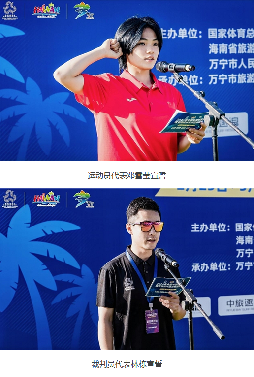 随后,运动员代表邓雪莹、裁判员代表林栋分别庄严宣誓。万宁市委常委、副市长刘超宣布赛事正式开幕,现场嘉宾共同鸣笛,标志着本届大赛正式开赛。