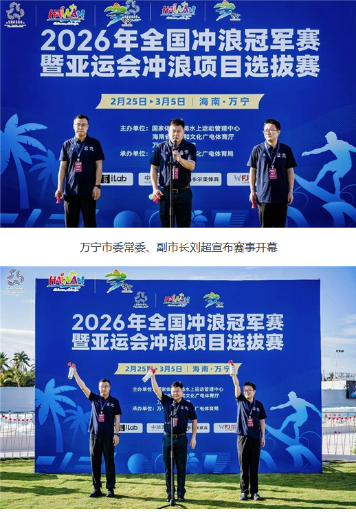 仪式上,万宁市旅游和文化广电体育局副局长党福俭致欢迎辞。他表示,近年来万宁锚定“世界冲浪胜地”目标,以冲浪为核心,深度融合侨乡文化、雨林生态及免税消费等资源,全力构建“冲浪+”业态。他指出:“本次赛事不仅是健儿们切磋技艺的竞技场,更是选拔亚运英才的关键平台,也是万宁深化‘体育+旅游+文化+消费’融合的重要契机。依托海南自贸港建设优势,我们将以顶级赛事为引,完善产业链条,打造具有全球竞争力的冲浪产业生态圈。”