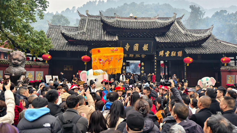 今年,刚刚于2026年1月1日起永久免费开放的报国寺,在这个春节化身为连接宫廷雅韵与巴蜀风情的“文化会客厅”。踏入第一山亭广场,张灯结彩的喜庆氛围扑面而来,红墙金瓦的紫禁城元素与峨眉山的灵秀风光交相辉映,不少市民游客已慕名前来打卡留念,提前感受南北交融的独特年味。