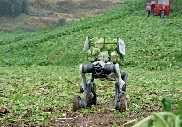 今年,田垄间多了一群特殊的“搬运工”。云深处科技四足机器人专程赴涪陵开展公益助收行动,将具身智能机器人引入田间地头,实实在在的为老百姓解决问题。在助收现场,四足机器人沿着狭窄田垄深入采收点,在湿滑泥路中稳定穿行,将一筐筐青菜头从地头运往集中堆放点。凭借强劲负载能力,云深处科技机器狗单次驮运量远超人工搬运,大幅减少往返次数;同时,在路线交错复杂的山地菜田环境中,机器狗依托搭载的传感器能实时识别石块、水坑等障碍,自动调整行进路线完成绕行,按设定点位精准往返于采收点与集中堆放点,实现从田间到堆场的自动化配送,让青菜头转运更高效顺畅。