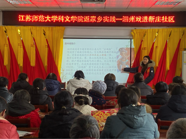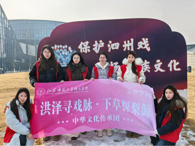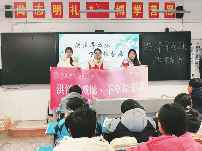 洪泽湖畔文脉悠长,淮水之滨戏韵流淌。在宿迁市泗洪县这片底蕴深厚的文化沃土上,被誉为“拉魂腔”的泗州戏历经百年传承,从田间地头的民间小调,逐步发展为国家级非物质文化遗产,成为江淮大地极具辨识度与感染力的文化符号。为深入挖掘传统戏曲文化内涵,推动非遗活态传承与创新发展,近日,江苏师范大学科文学院文理学院“洪泽寻戏脉·下草探梨源”中华文化传承实践团奔赴泗洪县,以溯源、体验、传播、建言四维路径,开展沉浸式非遗传承实践活动。青年学子用脚步丈量乡土,用心灵聆听戏韵,用行动守护传承,让古老泗州戏在新时代焕发蓬勃生机。