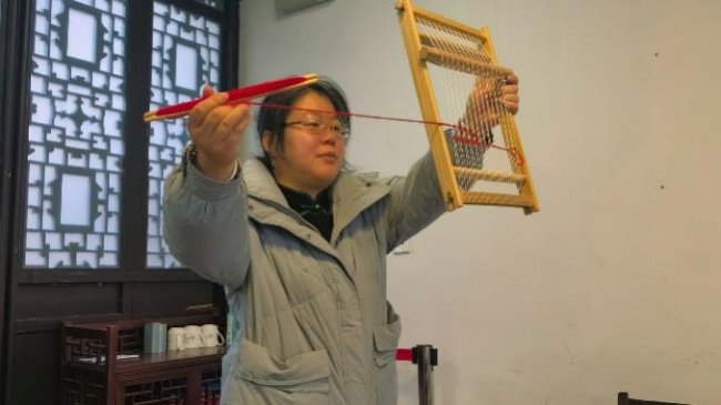 之后,每位队员都来到简化大花楼织机前,在陈霖老师的指导下学习“投梭引纬”。随着梭子在手中穿梭,云锦的基本织造原理“通经断纬”化为可触可感的编织韵律,变得具体而生动。陈霖老师亲自指导每位队员,确保大家都能领悟织机的基本原理,并织出独属于自己的“云锦微作品”。经纬交错间,每个人都织就了独属自己的非遗记忆。