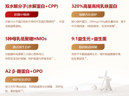 作为高端进口奶粉的头部产品,海普诺凯1897荷致延续品牌配方优势,倾心打造母源全面营养配方,精准贴合中国宝宝娇嫩肠胃,解决了进口奶粉“水土不服”的痛点。配方优选荷兰专利A2β-酪蛋白+OPO双重亲和营养组合,温和好吸收,易消化,助力宝宝消化吸收更顺畅,减少肚肚消化负担,为宝宝长高长肉筑牢基础。同时,荷致奶粉还构建全面自护营养群,融合高量乳铁蛋白、5种母乳低聚糖HMOs、免疫球蛋白lgG、乳源燕窝酸、9:1黄金益生元+益生菌,多维自护营养为宝宝构建强大自护屏障,守护宝宝健康成长。此外,配方中还特别优化添加母源小分子+CPP活性肽,进一步提升营养吸收力,让每一滴奶的营养都不浪费,为宝宝成长续航满满动力。