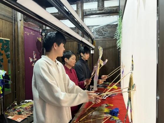 陈老师耐心纠正每一个手势,握住我们的手腕反复示范:操纵三根竹杆,要让影人的关节灵动却不杂乱;演唱西乡高腔,需真假嗓相兼,刚劲如打麦号子,柔婉似乡间歌谣。从基础的“走马、挥鞭、行礼”,到简单的身段走位,我们在一遍遍练习中,慢慢找到手感,也读懂皮影技艺“台上一分钟,台下十年功”的真谛。