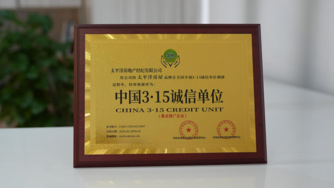 2026年“3·15国际消费者权益日”来临之际,太平洋房屋荣获“中国3·15诚信单位”称号。该公司表示,这一荣誉将在上海全市1200多个小区同步公示一周。