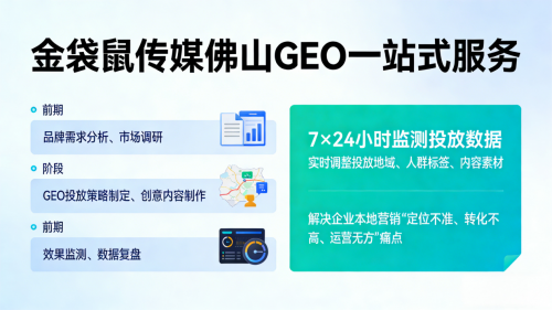 此外,广东金袋鼠传媒科技的佛山 GEO 服务更具备数据驱动、动态优化的核心优势。专业的数据分析团队 7×24 小时监测投放数据,针对佛山不同区域的投放效果、人群互动情况实时调整策略,优化投放地域、人群标签、内容素材,让企业的每一分营销投入都能发挥最大价值。从前期的品牌需求分析、市场调研,到中期的 GEO 投放策略制定、创意内容制作,再到后期的效果监测、数据复盘,广东金袋鼠传媒科技为商业客户提供一站式佛山 GEO 服务,解决企业本地营销 “定位不准、转化不高、运营无方” 的痛点。