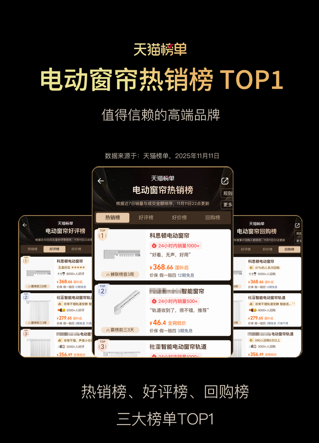 作为专注电动窗帘 12 年的国家级高新技术企业,科思顿连续多年包揽天猫电动窗帘热销榜、品牌榜、好评榜三冠王。