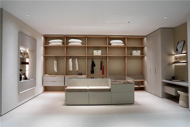 “栖境”衣帽间,以“光”为笔,“暖”为墨,构建了一个既具秩序感又充满温度的私享空间。不锈钢喷粉门板的精致、浅木纹的温润、皮革布艺的柔软相互碰撞,打破单一材质的冰冷。功能分区上,左侧玻璃柜为饰品展示区,中间开放格与挂杆实现衣物收纳与展示,岛台与沙发的结合则巧妙形成休憩换鞋区,右侧的梳妆台满足日常梳妆需求,动线流畅,分区明确。这里不仅是收纳的秩序之境,更是与生活温柔对话的栖足之地。