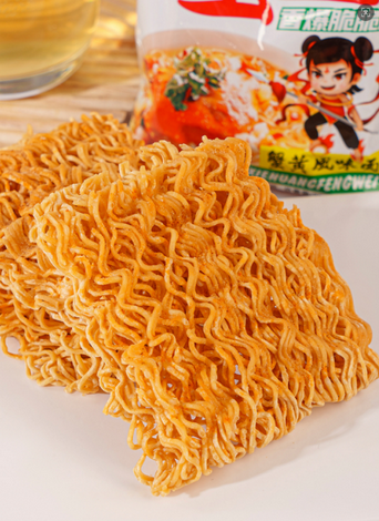 1.工艺升级:蟹黄干脆面采用三段式精准控温油炸工艺,通过 140℃→160℃→180℃的分段控温,使面饼含油量稳定在行业优质水平,既保留了传统酥脆口感,又实现轻油减糖的健康升级。同时,优化压延工艺,使面饼纹理更细腻、层次更丰富,入口“嘎嘣脆”,碎渣少,满足感更强。