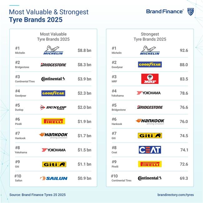 国际独立品牌估值咨询机构Brand Finance于2025年5月发布的年度报告显示,作为全球最有价值和实力的轮胎品牌,米其林的品牌价值较上一年度增长11%,达到88亿美元,连续第八年蝉联榜首。不仅如此,该品牌还获得了轮胎行业最高的品牌实力指数(BSI)分数——92.6分(满分100分)。这一成绩不仅领跑整个轮胎行业,即便放眼全球所有行业的顶尖品牌,也足以跻身前十五位。Brand Finance在报告中特别提到,米其林在全球几乎所有核心市场都获得了近乎满分的品牌熟悉度和消费者满意度,其长期积累的质量信誉与技术优势,构成了品牌最坚实的护城河。