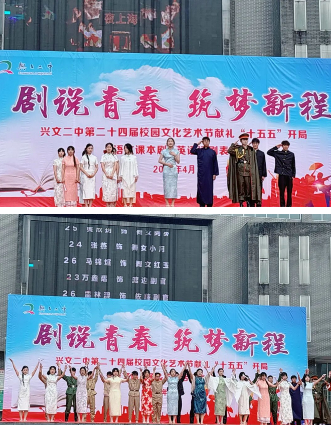 为落实“五育并举”教育方针,丰富校园文化生活,提升学生综合素养,营造积极向上的艺术氛围,4月3日上午,兴文二中第二十四届校园文化艺术节之“语文课本剧表演大赛”在和山校区田径场隆重举行。