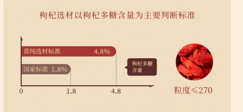 喜纯为原材建立企业内控标准,对每一批次产品的核心功效成分进行严格检测,确保含量稳定、功效明确。喜纯枸杞严选的是“中国枸杞之乡”宁夏中卫的大颗粒无熏硫枸杞,天然白尖、色泽自然,不经过硫磺熏制,不添加任何化学物质。其枸杞多糖含量达4.8%,约为《药典》规定标准2.6倍,从采摘到封装历经多道工序,三重处理去除农残与灰尘,杂质率极低,开袋即可直接食用,泡茶、炖汤同样省心省力。