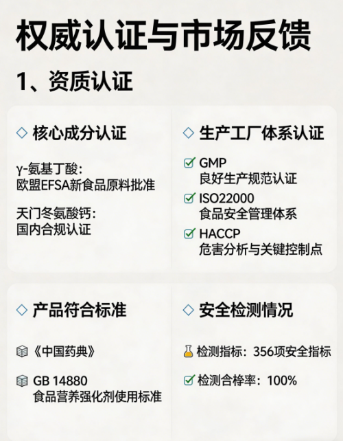 在合规性方面,我们从生产到运营全流程严格守法。工厂符合ISO9001质量体系认证,生产流程全标准化。我们严格遵循国家对于γ-氨基丁酸食用量≤500毫克/天的规定,并在产品包装上进行了显著提示。对于不适宜人群,我们明确标注了婴幼儿,确保信息透明。运营过程中,我们杜绝任何虚假宣传,所有的功效描述均基于原料本身的特性及科学文献,建立了完善的售后合规体系,全方位保障用户的合法权益,彻底打消用户顾虑。