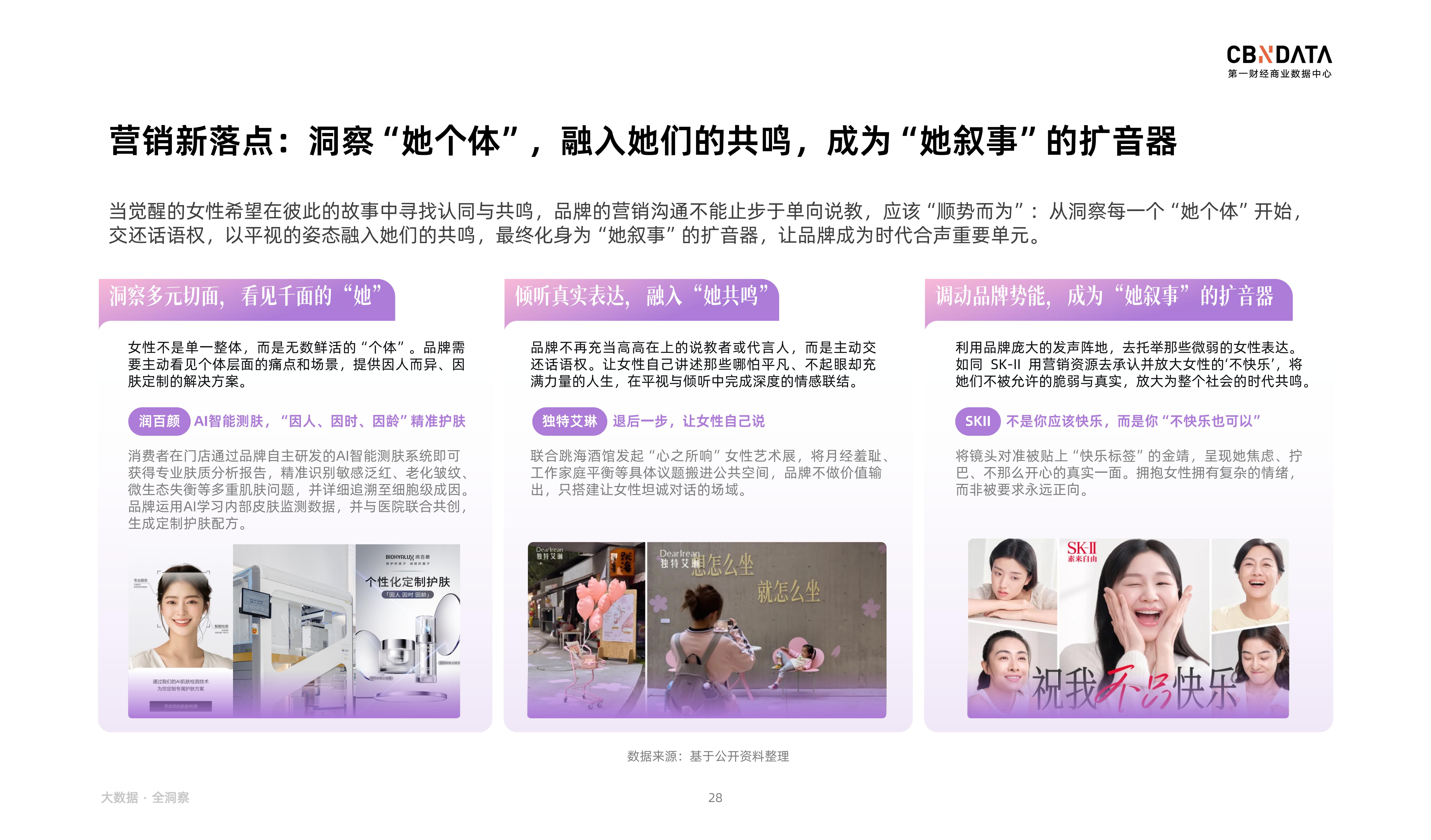 品牌开始主动把话语权交给消费者,融入女性的共鸣。润百颜通过AI智能测肤实现“因人、因时、因龄”精准护肤;独特艾琳联合跳海酒馆发起女性艺术展,将月经羞耻、工作家庭平衡等议题搬进公共空间,品牌不做价值输出,只搭建对话场域;SK-II用营销资源放大女性的“不快乐”,将脆弱与真实变为社会共鸣。营销侧的本质是:退后一步,让女性自己说,品牌成为扩音器。