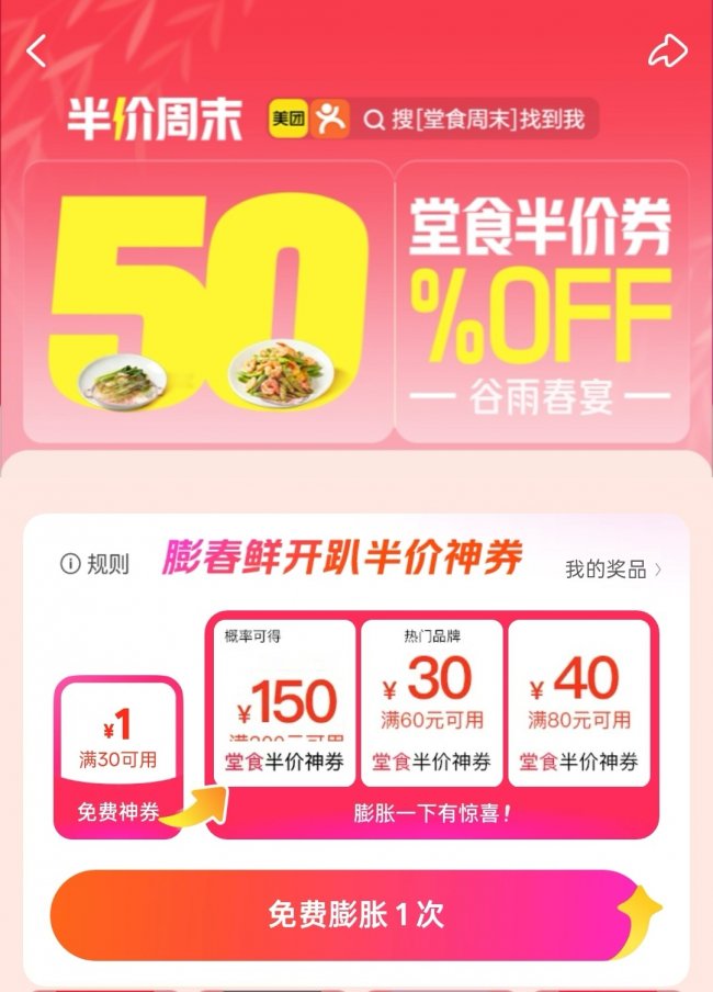 春意渐浓,时令鲜味轮番登场,周末外出用餐的热情也随之升温。为回应消费者对品质与性价比的双重期待,美团于4月起推出“春季美食半价”主题活动。消费者打开美团App搜索“堂食周末”即可直达活动会场,最高可得300-150元半价神券。本周活动于4月17日下午至4月19日准时开放,优惠权益 覆盖每个完整周末,让消费者以更实惠的价格解锁春日好味,尽享欢聚时光。