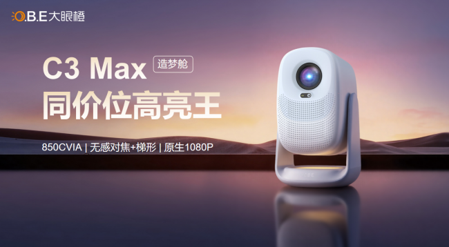 卧室系列革新之作——大眼橙C3 Max,专为高品质卧室观影量身打造。以850CVIA实测高亮度、原生1080P分辨率、无感自动对焦/梯形校正、智能避障等全功能配置,树立千元段产品体验标杆。产品搭载一体化夜灯云台,支持360°水平+120°俯仰调节,适配卧室多场景投射;风噪低于26dB,配合赛西低疲劳护眼认证与流畅智能化系统,打造舒适、安静、便捷的卧室观影体验。新品首发1299元。