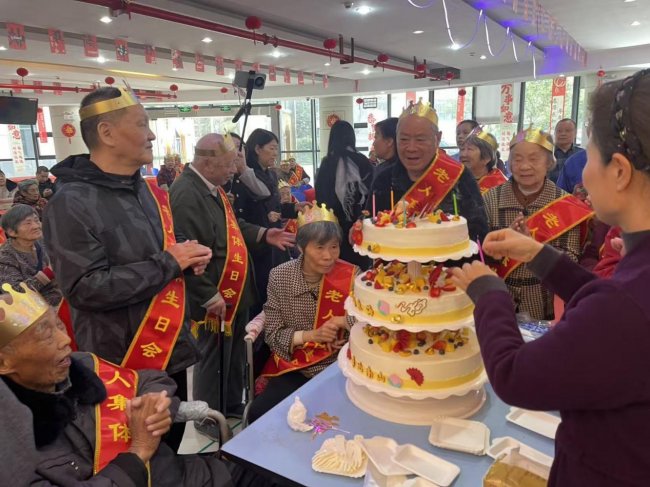 最令人动容的是温馨的集体生日会。志愿者点燃蜡烛,与44位老寿星同唱生日歌,歌声回荡在颐养院。大家为老人送上蛋糕与长寿面,老人们笑容满面、满含感动,现场暖意融融。