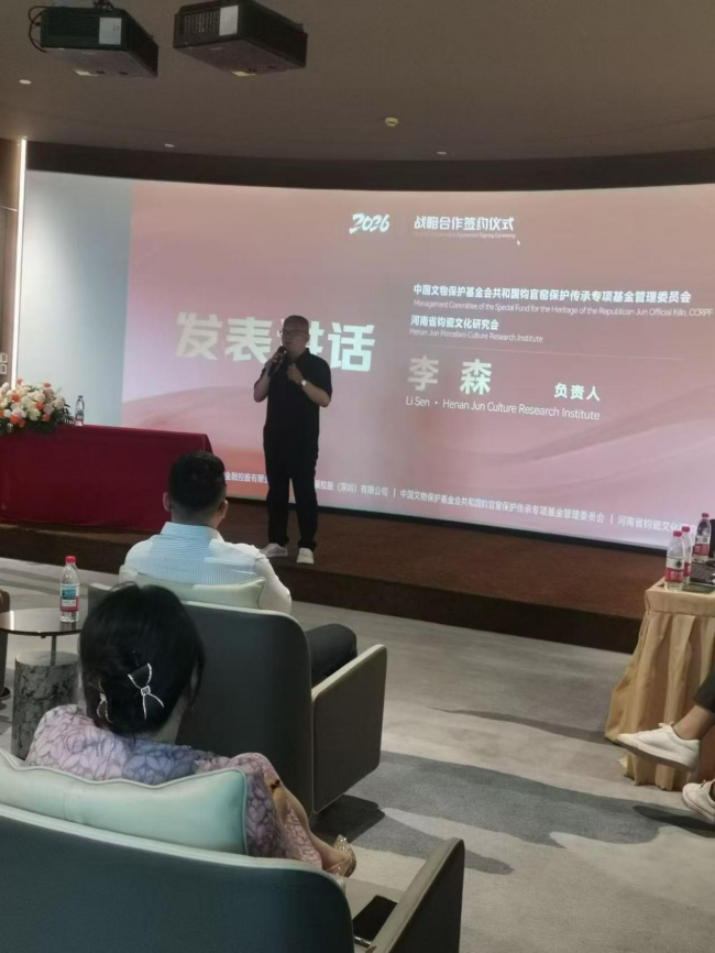 签约仪式上,中国文物保护基金会共和国钧官窑保护传承专项基金管理委员会负责人司振选与中彧金服控股(深圳)有限公司负责人程李芦代表双方签署战略合作协议。中国艺术金融控股有限公司执行董事刘昌盛博士、共和国钧官窑保护专项基金及河南省钧瓷文化研究会主任李森就此次合作发表了讲话。